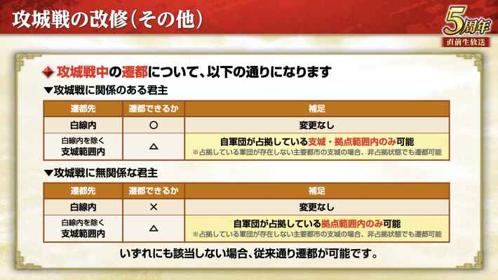 攻城戦中の遷都に関して、白線内はこれまで通り遷都可能となっている。そして支城範囲内に関しては、自軍団が占拠している支城または拠点の範囲内のみ遷都可能となる。