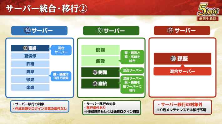 魏サーバーはこれまで通り無条件で全てのプレイヤーが移行できる。蜀サーバーに関しても、これまでと同様に条件を満たすプレイヤーのみ移行が可能となっている。