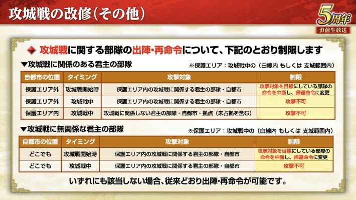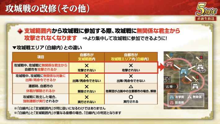 攻城戦の際に関する部隊の出陣と再命令に制限が課される。白線内と支城範囲内の「保護エリア」と保護エリア外の君主同士は互いに攻撃ができなくなり、攻撃命令をしていた場合は即座に帰還命令へ変更される。