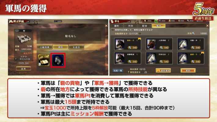 軍馬は砦の貢物や、軍馬メニューの獲得タブから入手できる。貢物として入手できる軍馬は、砦の所在地方によって所持する軍馬技能が異なる。軍馬は最大15頭まで所持可能となっており、上限は宝玉で増やせる。
