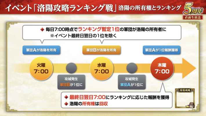 洛陽攻略ランキング戦の期間中は、ランキング暫定1位の軍団が洛陽を所有できる。そして最終日翌日の7時にランキングに応じた報酬が配布され、洛陽の所有権は回収される。