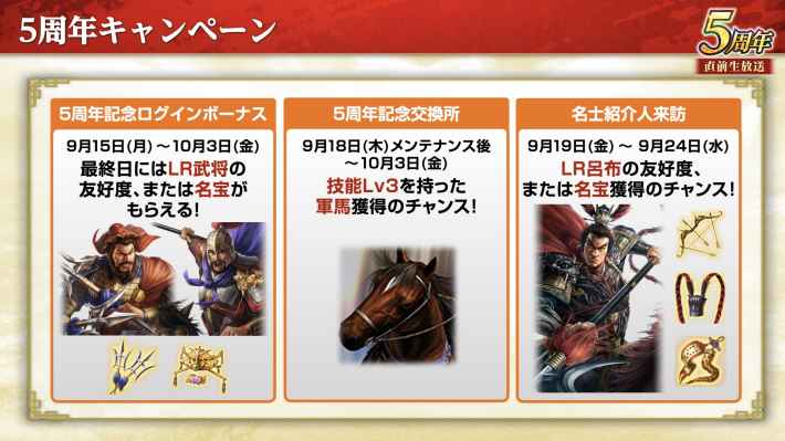 2.5周年を記念したログインボーナスや特別交換所も開催予定。さらに「名宝商人来訪」では、駐屯部隊向けの名宝を1種獲得可能となっている。