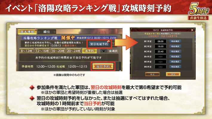 洛陽攻略ランキング戦に挑戦する時間は、前日の予約内容によって決まる。第6希望まで予約可能となっているが、他軍団と重複した場合は抽選となり、第6希望まで全て外れた場合は当日予約で時間を決定する。