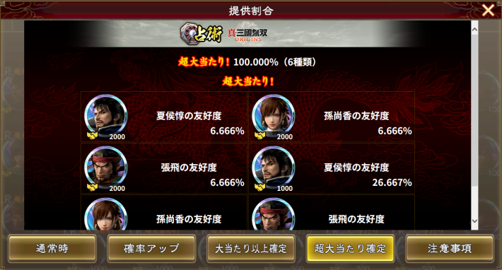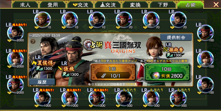 占術 真・三國無双 ORIGINSは『真・三國無双 ORIGINS』のコラボ武将が入手できる特別なガチャ。排出されるのはコラボ武将の友好度のみとなっており、有償宝玉か占術札・無双オリジンズを使うと引ける。
