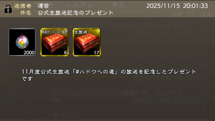 公式生放送記念プレゼントとして、占術札・無双オリジンズと極求賢札を選べる箱が配布されている。最大24枚の占術札が入手できるので、忘れずにメールから受け取ろう。