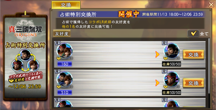 コラボ武将の友好度は、イベントの「占術特別交換所」で他のコラボ武将の友好度に変換できる。もし引きが偏った場合は、占術特別交換所で欲しい武将の友好度に変換しよう。