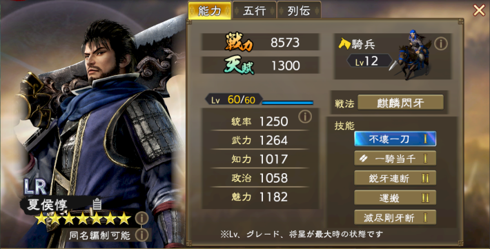 LR夏侯惇は畏怖と封撃で敵を妨害する騎兵武将。通常攻撃で封撃を付与できるのは強力だが、技能「鋭牙連断」に通常攻撃の間隔が2倍になるデメリットがあるため、LR張飛とLR孫尚香の方が入手優先度は高い。
