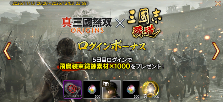 コラボ期間中は1日目のログインボーナスで、占術札・無双オリジンズが10枚入手できる。無料で入手できるのは貴重なので、画面右上のメニューからログインボーナスを受け取っておこう。