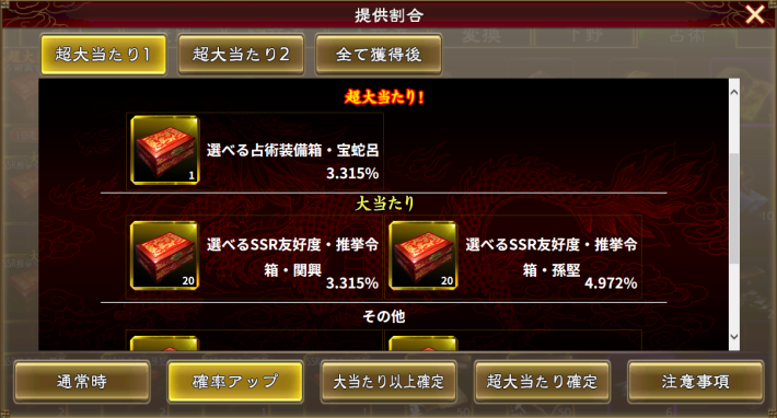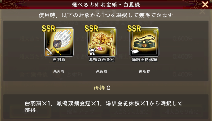 超大当たりの2回目では強力な装備品「名宝」が3種のうち1つだけ入手できる。白羽扇はLR諸葛亮の技能「伏龍」をLv4まで上げる際に必須なので、未入手であれば回収しておこう。