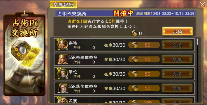 占術を1回引くと占術Ptを5Pt獲得し、獲得した占術Ptをアイテムと交換できる。今回の占術で登場する武将友好度や異文化宝物なども交換できる。
