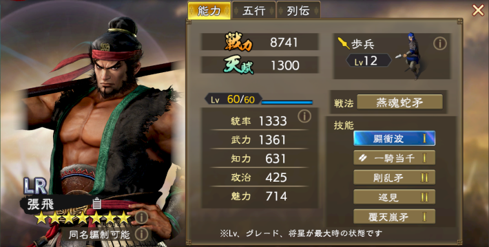 LR張飛は戦法で自部隊を強化する歩兵武将。将星★0から技能「剛乱矛」で壊滅ダメージを耐えられるため、今回のコラボ武将の中では入手優先度が最も高い。