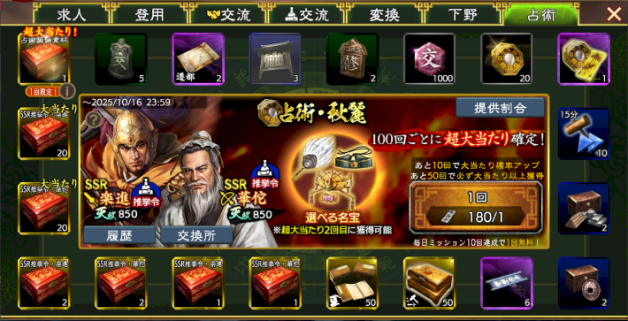 占術は10回ごとに大当たりの確率が上昇し、低レアリティのアイテムはラインナップから除外される。50回目は大当たり以上確定、100回目は超大当たり確定なので残り回数に応じて占術札の追加購入も検討しよう。