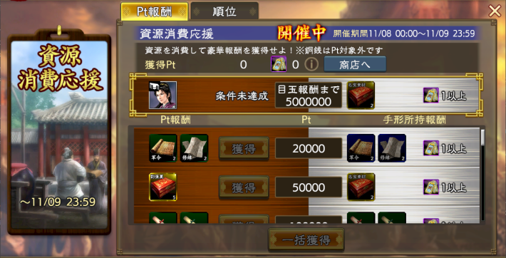 商店で資源消費応援手形を購入すると「選べる超求・遷都箱」や「選べる名宝素材箱・金玲克」などが追加で獲得できる。手形は3000円と宝玉4000個で販売されており、手形1つで全ての報酬が獲得可能になる。