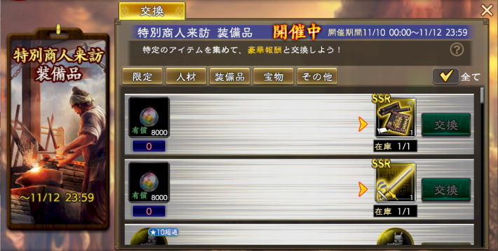 SR鉄戟 × 1【在庫:4】 | R武器 × 3 R防具 × 3 R文物 × 3 銅銭 × 400000 |