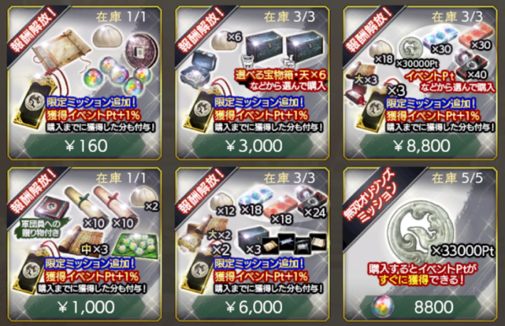 | ミッションパック・超 | 【価格】¥ 6000 【在庫】3個 【おすすめ度】★★★★・ 有償宝玉 × 3000 佩玉手形 × 2 軍令書回復・大 × 2 選べる戦備箱 × 3 コラボ購入特典Pt × 12 VIP Pt × 3000※以下から1つを選んで獲得 極求賢札 × 18 超求賢札 × 18 占術札・無双オリジンズ × 24 |