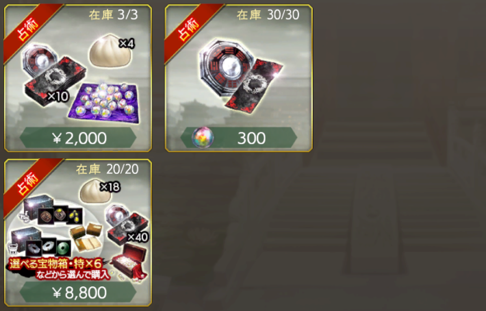 | 占術札・無双オリジンズ | 【価格】宝玉 × 300 【在庫】30個 【おすすめ度】★★★★・ 占術札・無双オリジンズ × 1 |