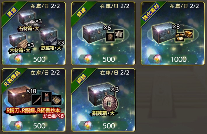 | 銅銭パック | 【価格】宝玉 × 500 【在庫】2個 【おすすめ度】★★★・・ 銅銭箱・大 × 3 |