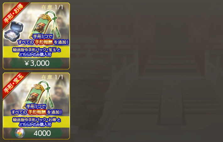 輸送指令の追加報酬は手形1つで全て解放できる。追加報酬には軍令書回復や名宝素材などが多く含まれておりお得なので、報酬を全回収できるのであれば手形を購入するのもあり。