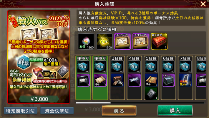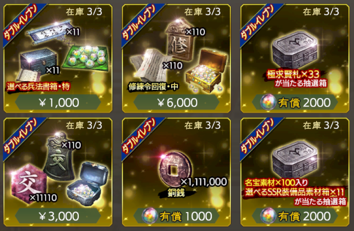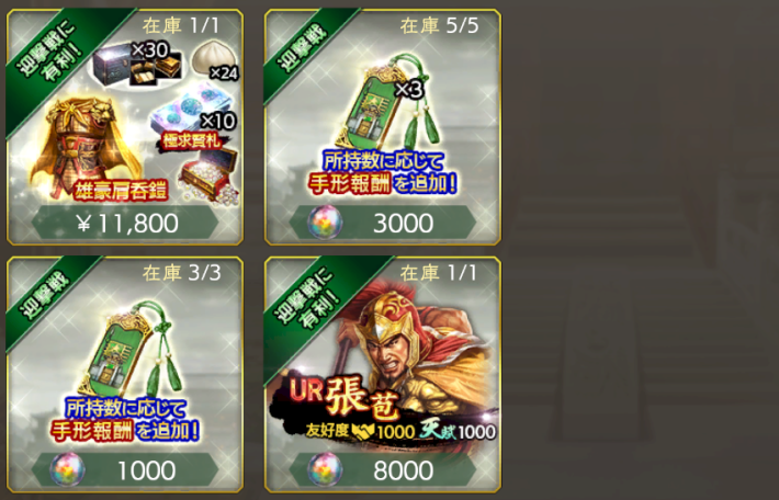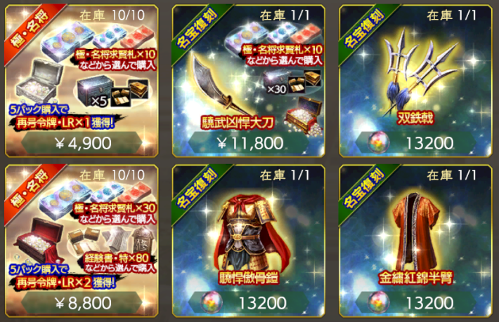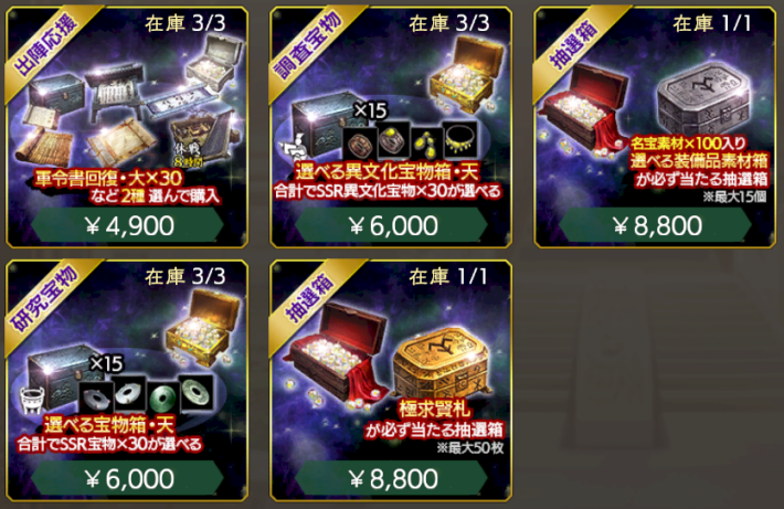 毎月君主パックの「超」と「出陣」では不足しがちな軍令書回復をお得に入手できる。毎月君主パックの「極求賢」では極求賢令に必要な極求賢札がお得に入手できるので、可能なら継続的に購入しよう。