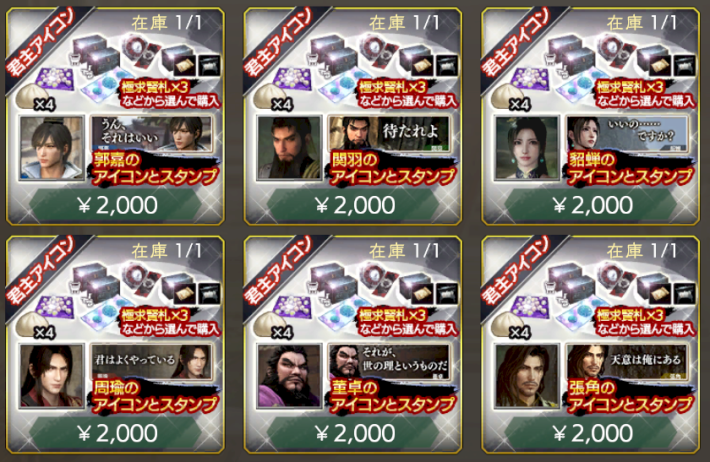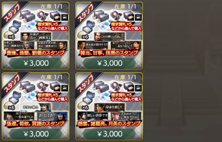 | アイコン&スタンプパック・関羽 | 【価格】¥ 2000 【在庫】1個 【おすすめ度】★★★・・ 有償宝玉 × 1000 関羽 真・三國無双 ORIGINS × 1 待たれよ × 1 コラボ購入特典Pt × 4 VIP Pt × 1000※以下から1つを選んで獲得 占術札・無双オリジンズ × 5 極求賢札 × 3 選べる戦備箱・超 × 3 選べる宝物箱・天 × 2 選べる異文化宝物箱・天 × 2 |