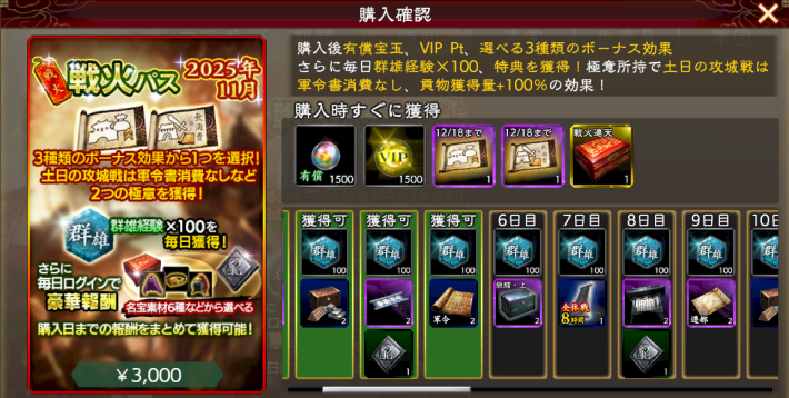 高LvのVIP特典でしか利用できなかった「部隊の一括出陣」と「部隊6」が編制可能になるパス。高ランクの主要都市への攻城戦等、少しでも戦力がほしい時に利用しよう。