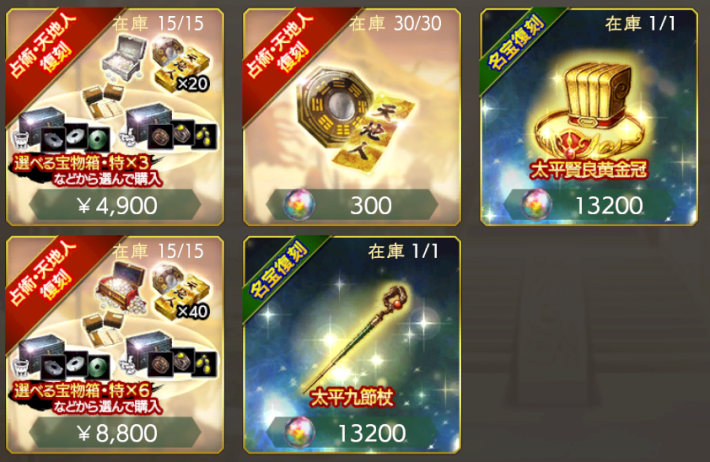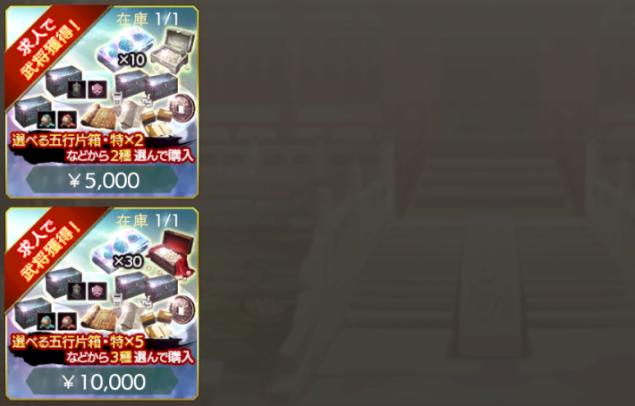 | 初陣パック・銅銭 | 【価格】宝玉 × 300 【在庫】15個 【おすすめ度】★★★・・ 銅銭 × 500000 |