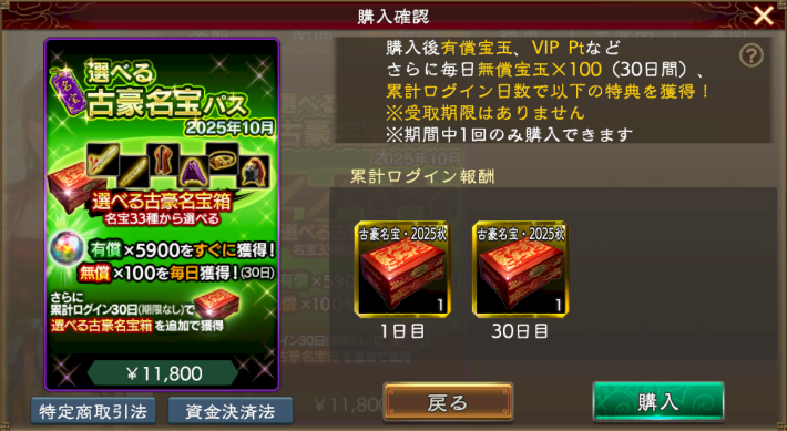 | 古豪名宝パス | 【価格】¥ 11800 【在庫】1個 【おすすめ度】★★★・・ 有償宝玉 × 5900 VIP Pt × 5900※ログインで毎日獲得 宝玉 × 100※ログイン1日目に獲得 選べる古豪名宝箱・2025秋 × 1※ログイン30日目に獲得 選べる古豪名宝箱・2025秋 × 1 |