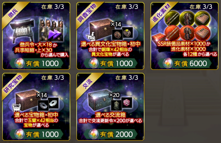 | ブラックフライデーパック・交流 | 【価格】有償宝玉 × 2000 【在庫】3個 【おすすめ度】★★★・・ 選べる交流箱 × 20 |