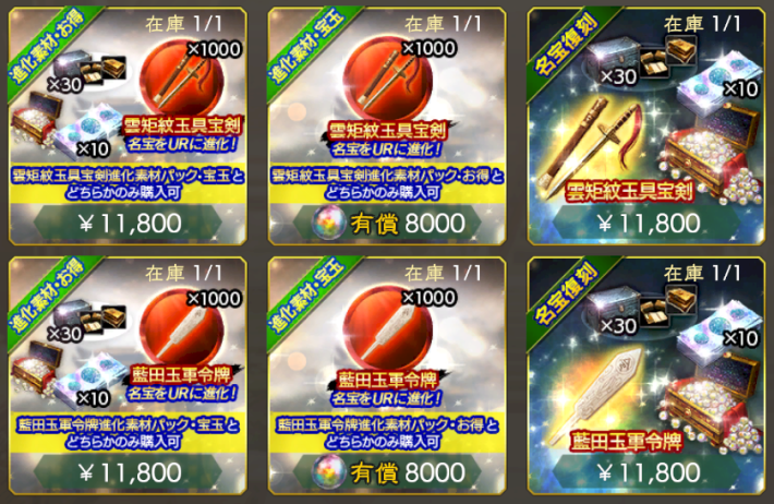 各種名宝の進化素材 × 1000が有償宝玉 × 8000で購入できる。名宝の中には進化して鍛錬を進めると強力な効果が追加されたり汎用性が大きく向上するものもあるため、鍛錬が十分に進んでいる場合は進化を検討しよう。