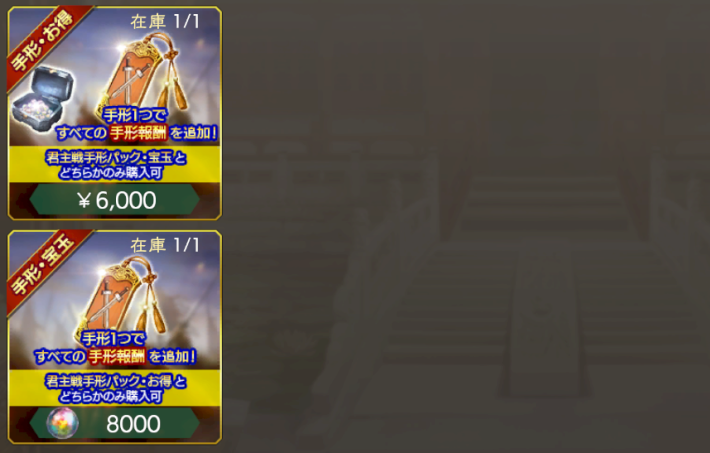 | 君主戦手形パック・宝玉 | 【価格】宝玉 × 8000 【在庫】1個 【おすすめ度】★★★★・ 君主戦手形 × 1 |