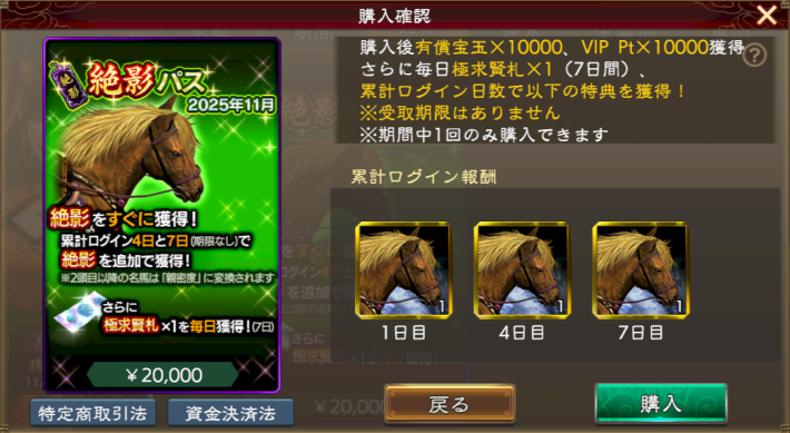 | 絶影パス | 【価格】¥ 20000 【在庫】1個 【おすすめ度】★★★・・ 有償宝玉 × 10000 VIP Pt × 10000※ログインで毎日獲得 極求賢札 × 1※ログイン1日目に獲得 絶影 × 1※ログイン4日目に獲得 絶影 × 1※ログイン7日目に獲得 絶影 × 1 |