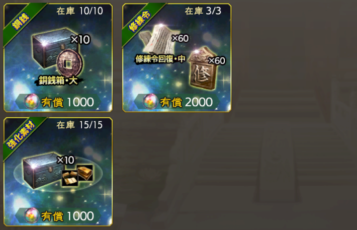 | 初陣パック・修練 | 【価格】宝玉 × 250 【在庫】15個 【おすすめ度】★★★・・ 修練令回復・大 × 5 |