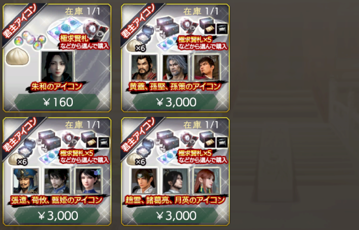 | アイコンパック・張荀甄 | 【価格】¥ 3000 【在庫】1個 【おすすめ度】★★★・・ 有償宝玉 × 1500 張遼 真・三國無双 ORIGINS × 1 荀攸 真・三國無双 ORIGINS × 1 甄姫 真・三國無双 ORIGINS × 1 コラボ購入特典Pt × 6 VIP Pt × 1500※以下から1つを選んで獲得 占術札・無双オリジンズ × 7 極求賢札 × 5 選べる戦備箱・超 × 5 選べる宝物箱・天 × 3 選べる異文化宝物箱・天 × 3 |