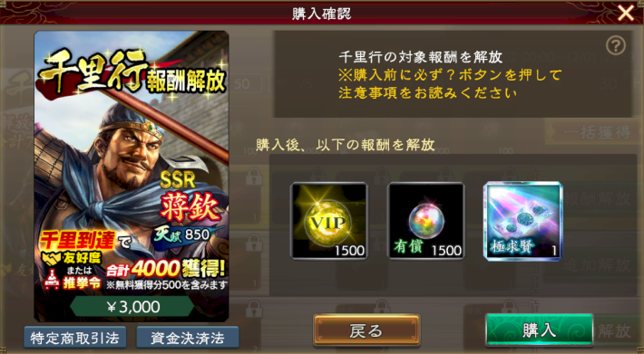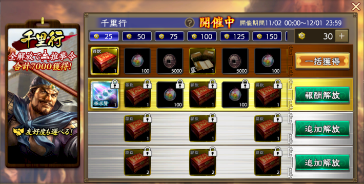 無料分で得られる友好度と推挙令は500だけなので武将の登用や起用はできない。なので追加で欲しい場合は課金して「報酬解放」と「追加解放」を購入しよう。