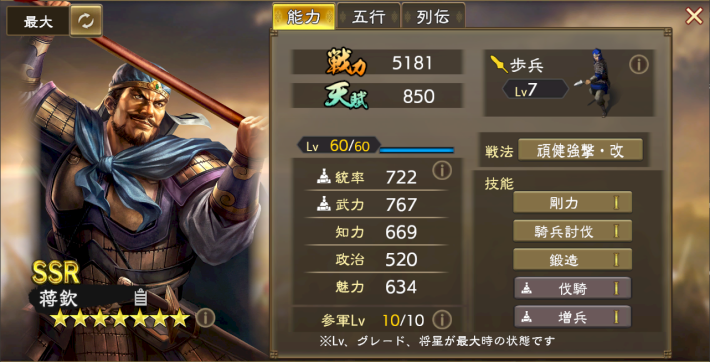 主な報酬はSSR武将「蒋欽」 の友好度と推挙令。参軍技能「伐騎」で騎兵に対しての与ダメージが増え、技能「増兵」で自部隊の兵力が増えるため、対LR袁紹の編制においては活躍が期待できる。