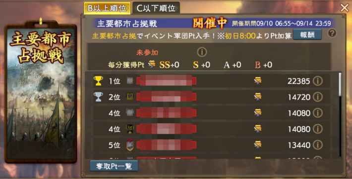 ランキングはBランク以上の都市を占拠している軍団と、Cランク以下の都市を所持している軍団とで分かれている。Bランク以上の都市を所持している場合、C城以下ランキングは0Ptになるので、上位軍団とは別の戦場で競うことができる。