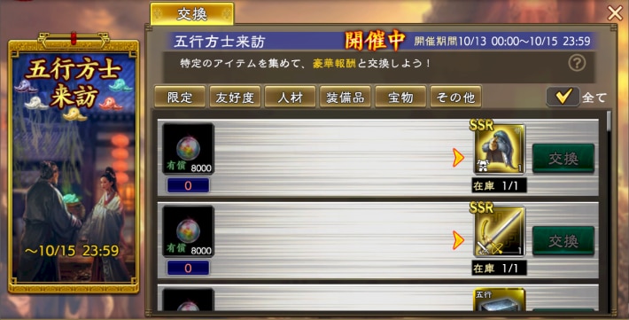 五行方士来訪は所持しているアイテムを別のアイテムに交換できるイベント。今回の開催では特に五行関連の交換が充実しているので、各武将の五行の強化を目指そう。