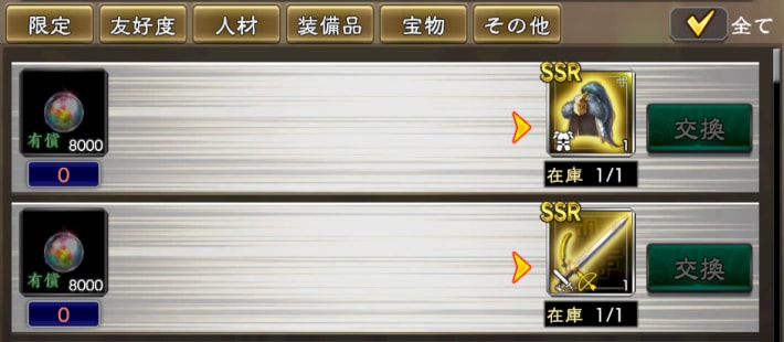 武将の友好度や推挙令を集める際に必要なアイテム。交流Ptはゲームを進めるうえで大量に消費するため、余っている装備品があれば交換しておこう。
