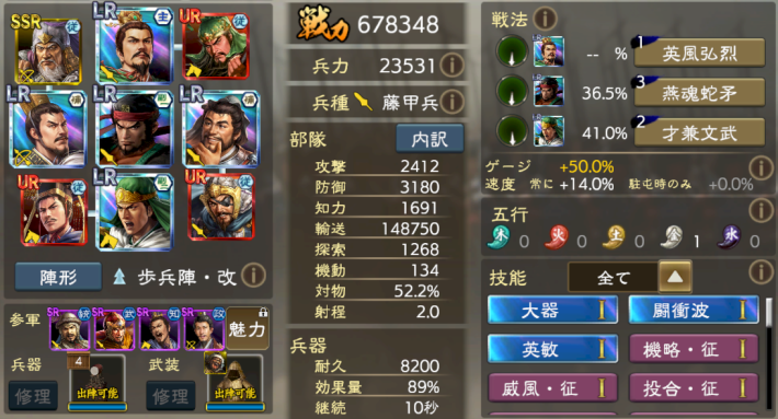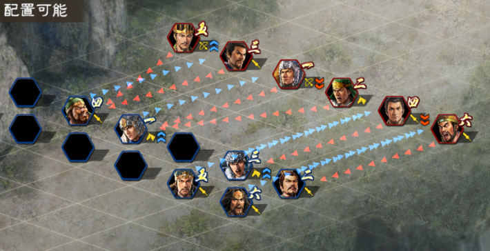 趙雲隊と許褚隊の逆襲によるカウンターで敵を撃破しつつ、その他の部隊で管夷吾隊と田豊隊を攻撃する編制。LR劉備の強力な戦法を少しでも早く発動するため、覚醒厳顔の技能「遠射」で射程を伸ばしている。