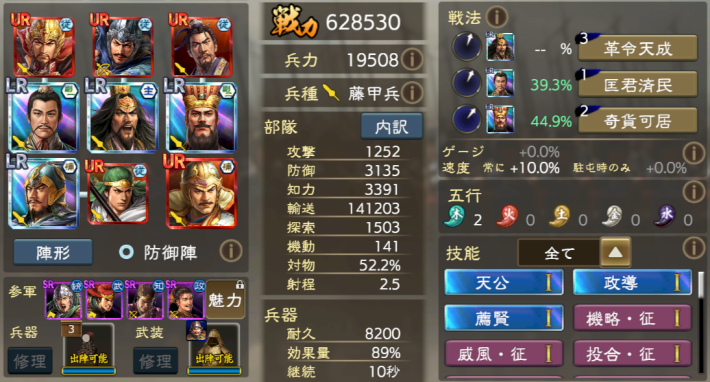 部隊の戦法速度+20% 付与してきた部隊の「出陣時の防御の150%」分、付与された部隊の攻撃、防御、知力に上乗せする(効果時間中に同一効果が発生した場合、上乗せする攻撃、防御、知力の値は高い方の値で上書きされる) |