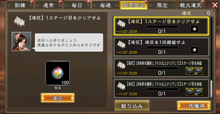 遠征の期間中は限定ミッションが出現する。基本的に「極求賢令で新登場した武将を編制する」が条件となっているので、可能であれば新武将を編制したうえで遠征に挑戦しよう。