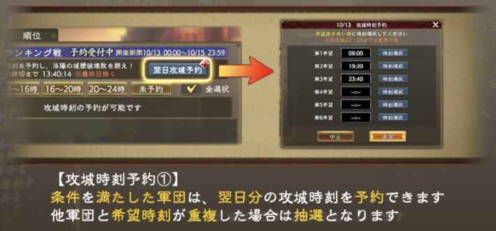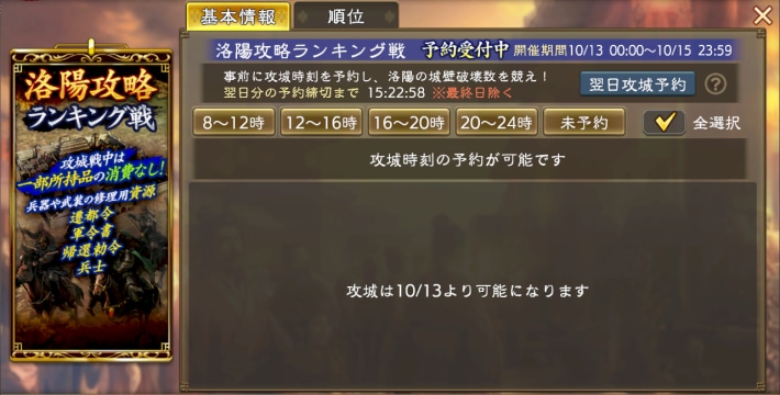 まず、洛陽攻略ランキング戦のイベント画面から挑戦する時刻を予約しよう。予約は第6希望まで可能となっており、翌日は希望の中から当たった時刻に洛陽で攻城戦を行う。