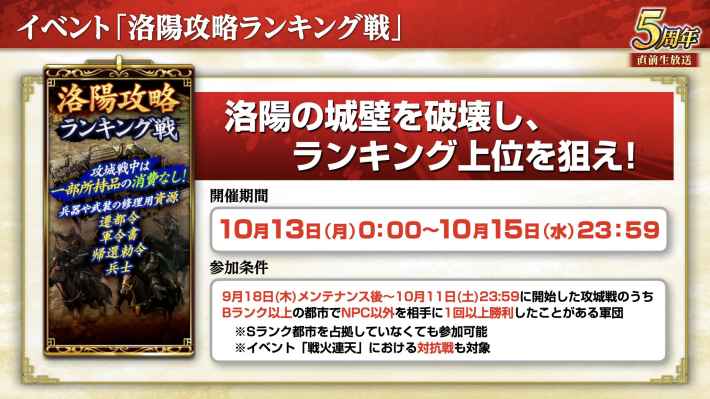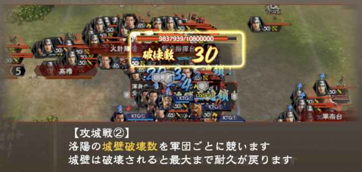 洛陽攻略ランキング戦は、SSランク主要都市「洛陽」を舞台に10分間で城壁に与えたダメージ量を競うイベント。そして、毎日7時にランキング暫定1位の軍団が洛陽の所有権を獲得できる。