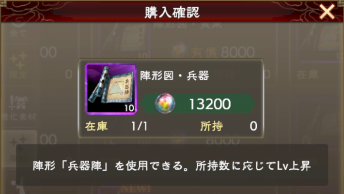 兵器陣は商店で「陣形図・兵器」を入手すると解放される。陣形図・兵器は宝玉13200個で購入できるが、研究の序論「陣形解放」が開放されていなければ使用できないので注意しよう。