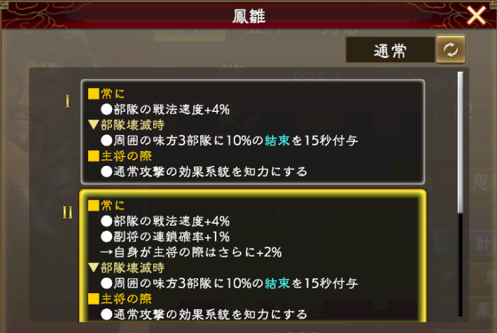 | 鳳雛1 | ■常に ●部隊の戦法速度+4% ▼部隊壊滅時 ●周囲の味方3部隊に10%の |