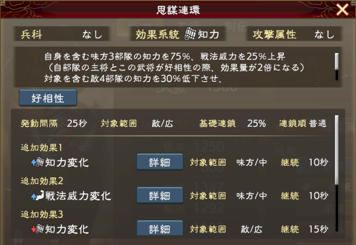 | 戦法 | 思謀連環 自身を含む味方3部隊の知力を75%、戦法威力を25%上昇(自部隊の主将とこの武将が好相性の際、効果量が2倍になる) 対象を含む敵4部隊の知力を30%低下させて、通常攻撃の対象部隊数-2、戦法の対象部隊数-2 さらに300%の攻撃 【発動間隔:25秒 / 連携順:普通】 |