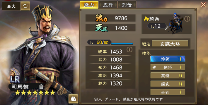 | 技能 | 鬼謀 ■主将の際 ●通常攻撃の効果系統を知力にする ●部隊の会心発生+1% 果決 ■常に ●部隊の防御+3% →主将か、副将か補佐で主将と自身が好相性の際は効果が2倍(+6%) ●部隊の知力+3% →主将か、副将か補佐で主将と自身が好相性の際は効果が2倍(+6%) ■主将か、副将か補佐で主将と自身が好相性の際 ▼駐屯/防衛中に交戦開始時 ●対象を含む敵4部隊に3%の 調和(★7で解放) ■副将か補佐で、主将と自身が好相性の際 ●部隊の知力+4% |