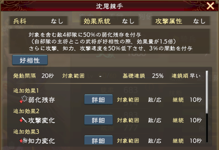 | UR張春華連鎖率:35% / 連携順:早い 対象を含む敵4部隊に50%の さらに攻撃、知力、攻撃速度を50%低下させて3%の |