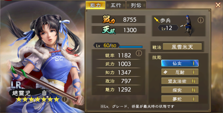 LR趙霊児は能力強化を2倍にして戦法ダメージを与える知力歩兵武将。戦法で敵に付与する