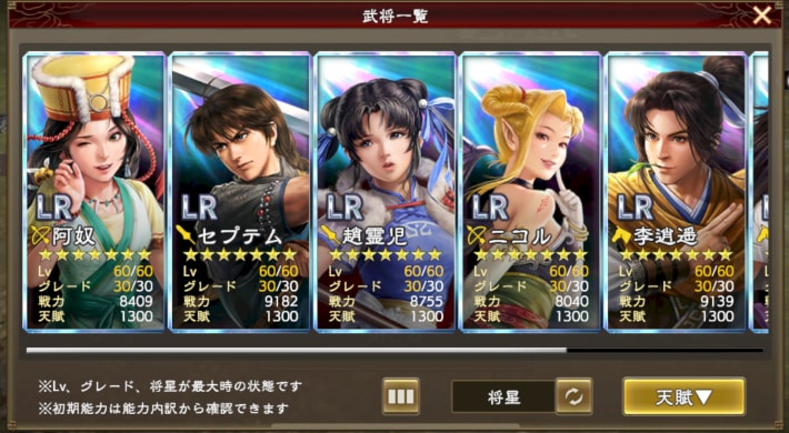 現時点でLRセプテムとLRニコルは、日本語版の三國志 覇道では入手不可となっている。混合サーバーでプレイしている場合、攻城戦や野戦などで繁体字版のユーザーが使用してくる可能性があるので注意。